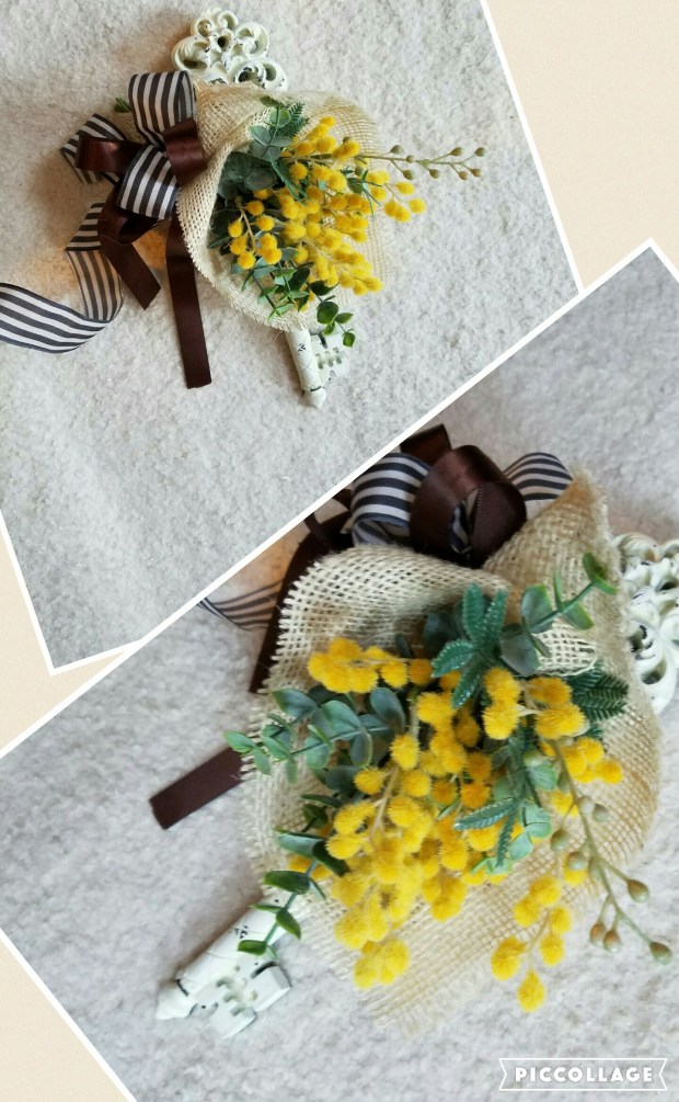 アンティークなデザインの飾りにミモザの花束をつけてみましたぁ(*^^*)