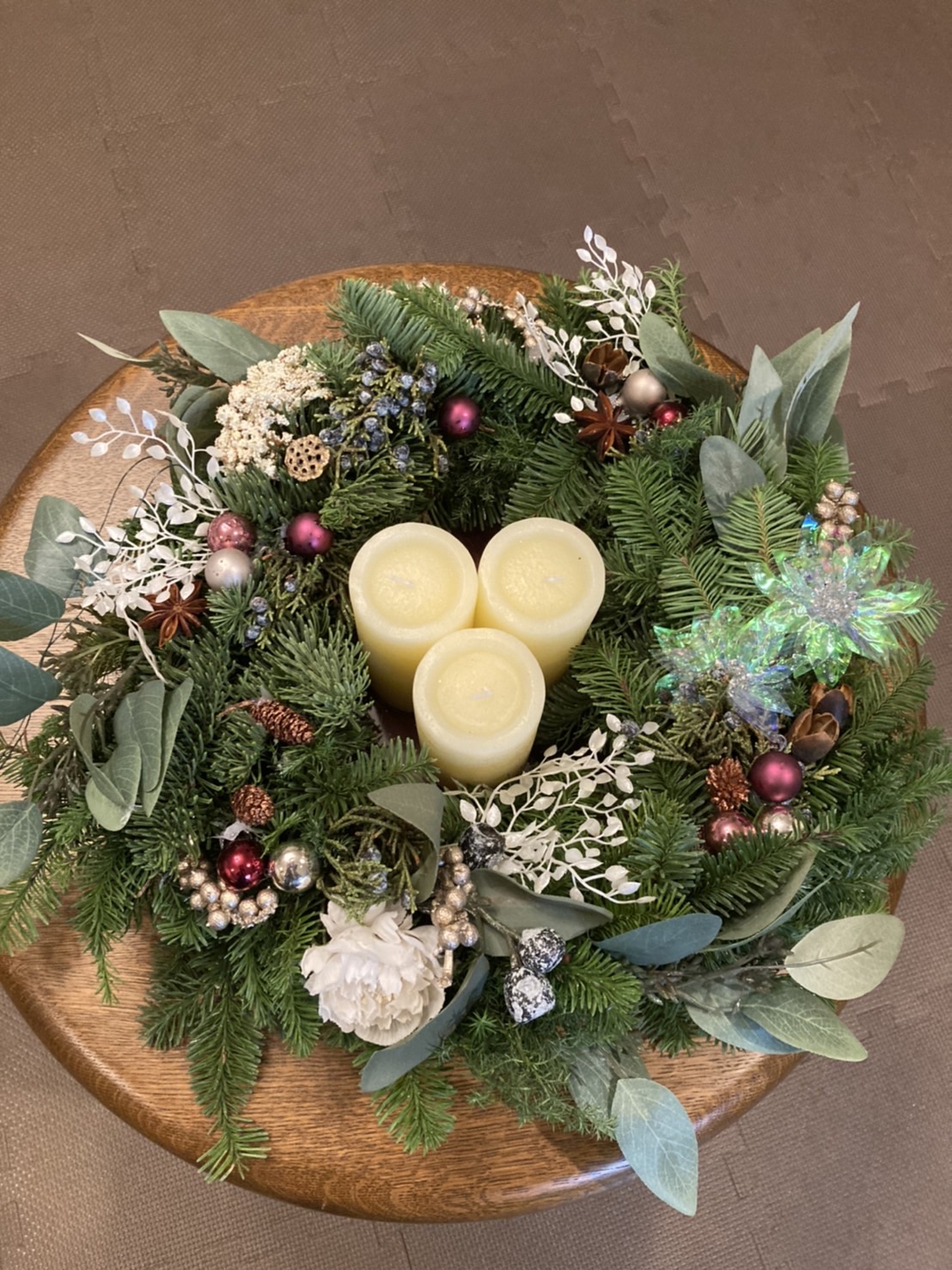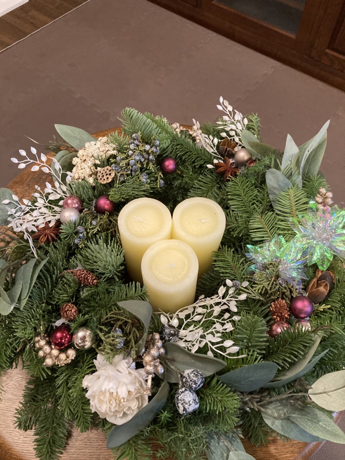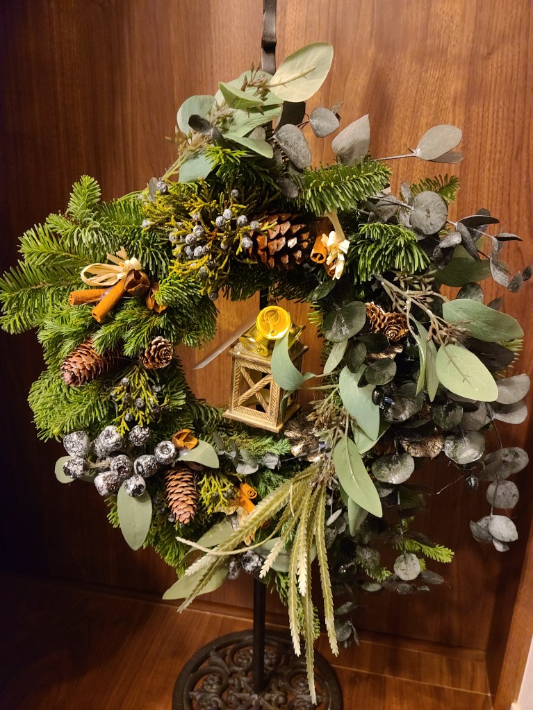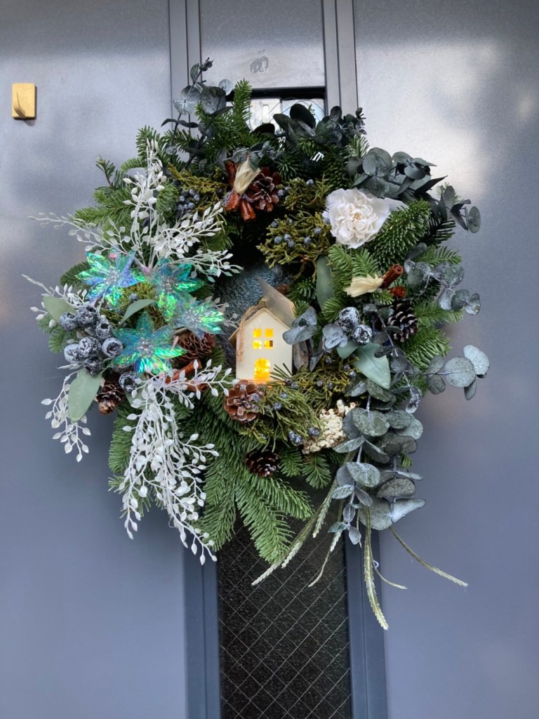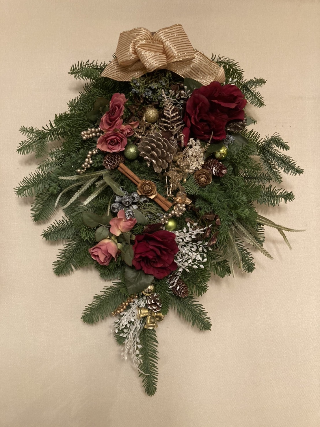 今回のスワッグリースでは、生のオレゴンヒバ・ネズの枝の実付き・アーティフィシャルフラワーのバラの赤とピンク・マツボックリ・マツボックリの小さい実物・ホワイトリーフ・ユーカリの黒い実・シナモンステイック・リボンを使い作りました。大きさ40㎝~50㎝とボリュームのある作品です。
