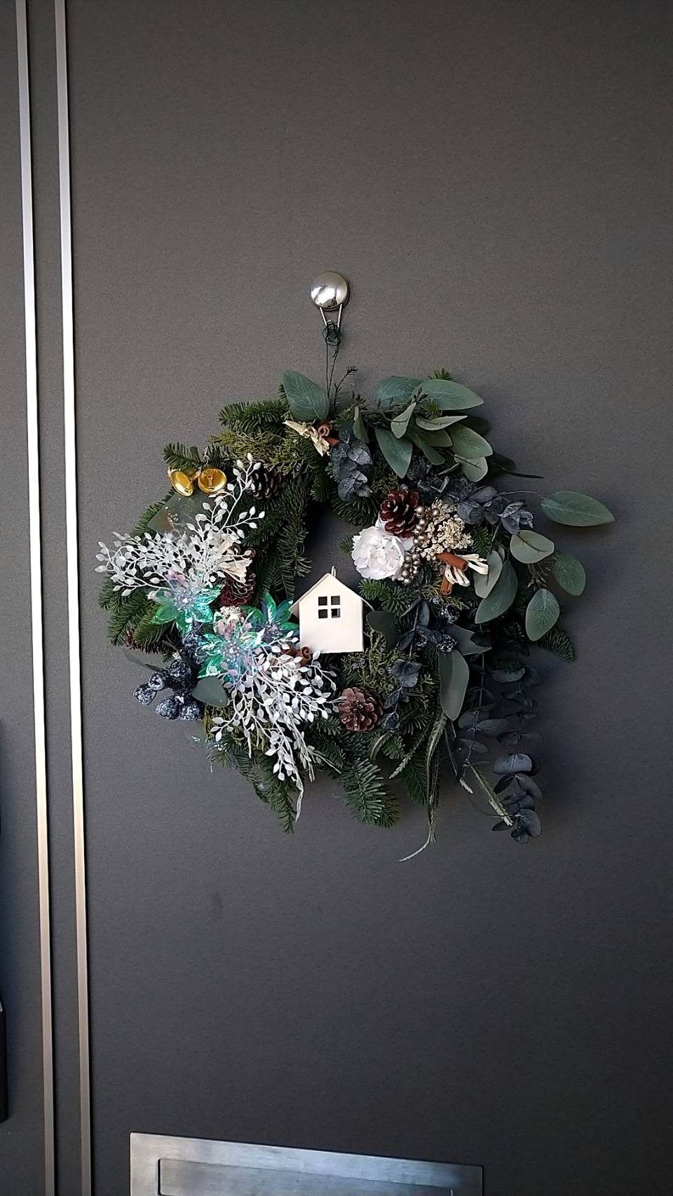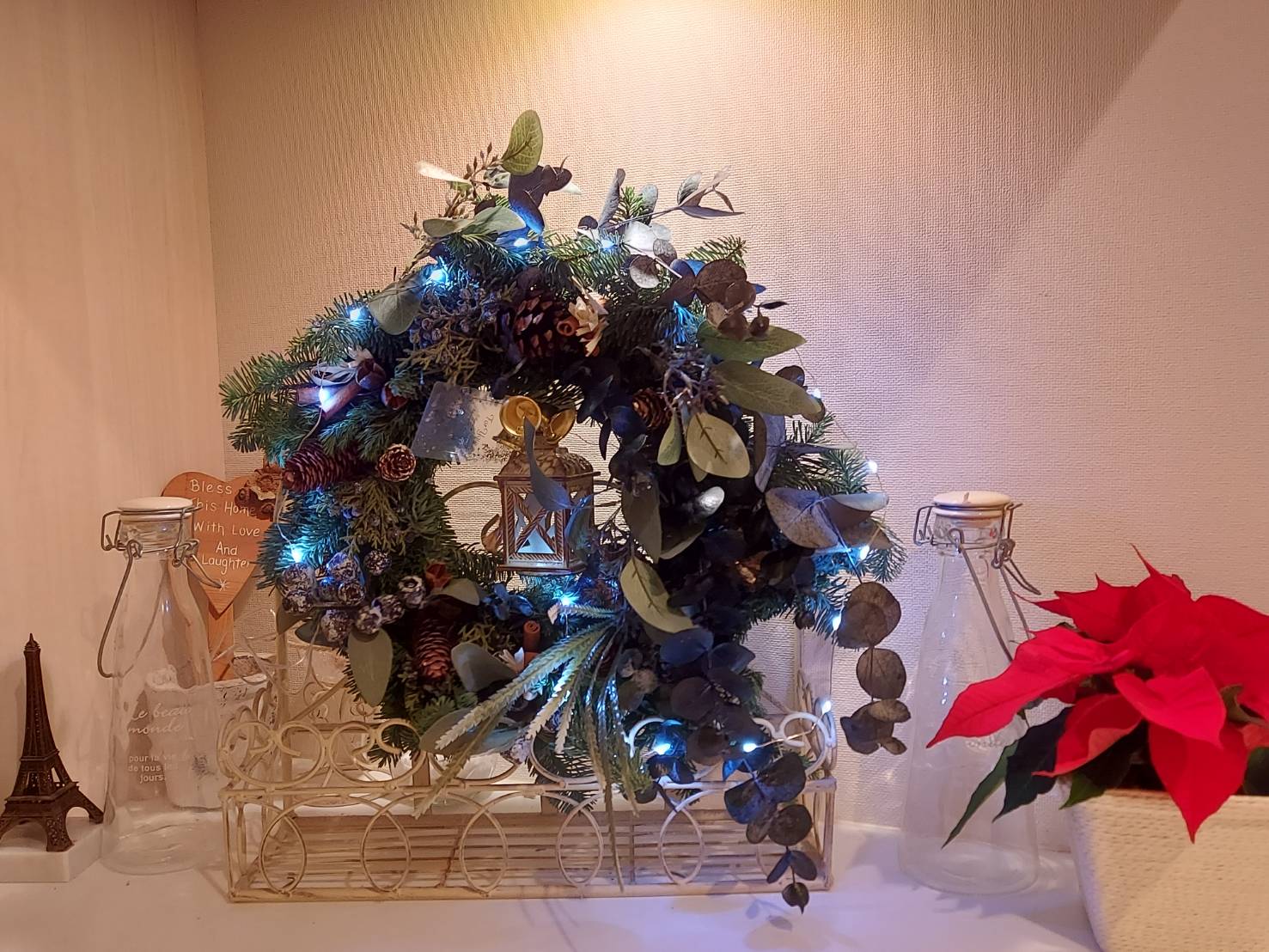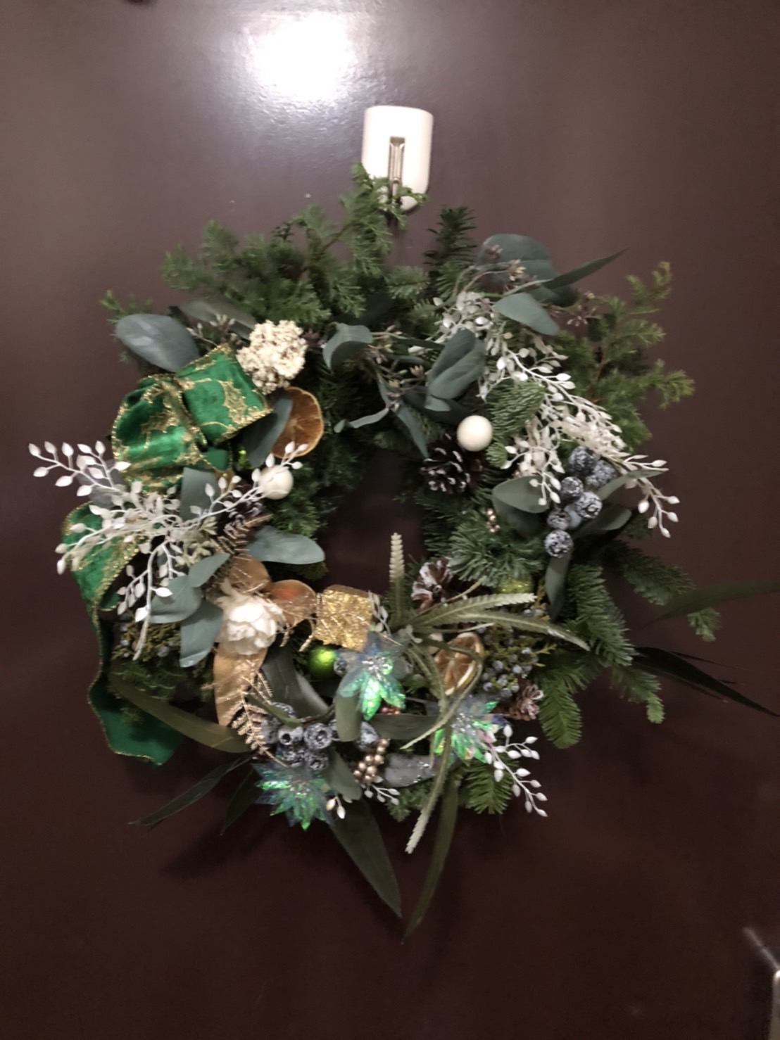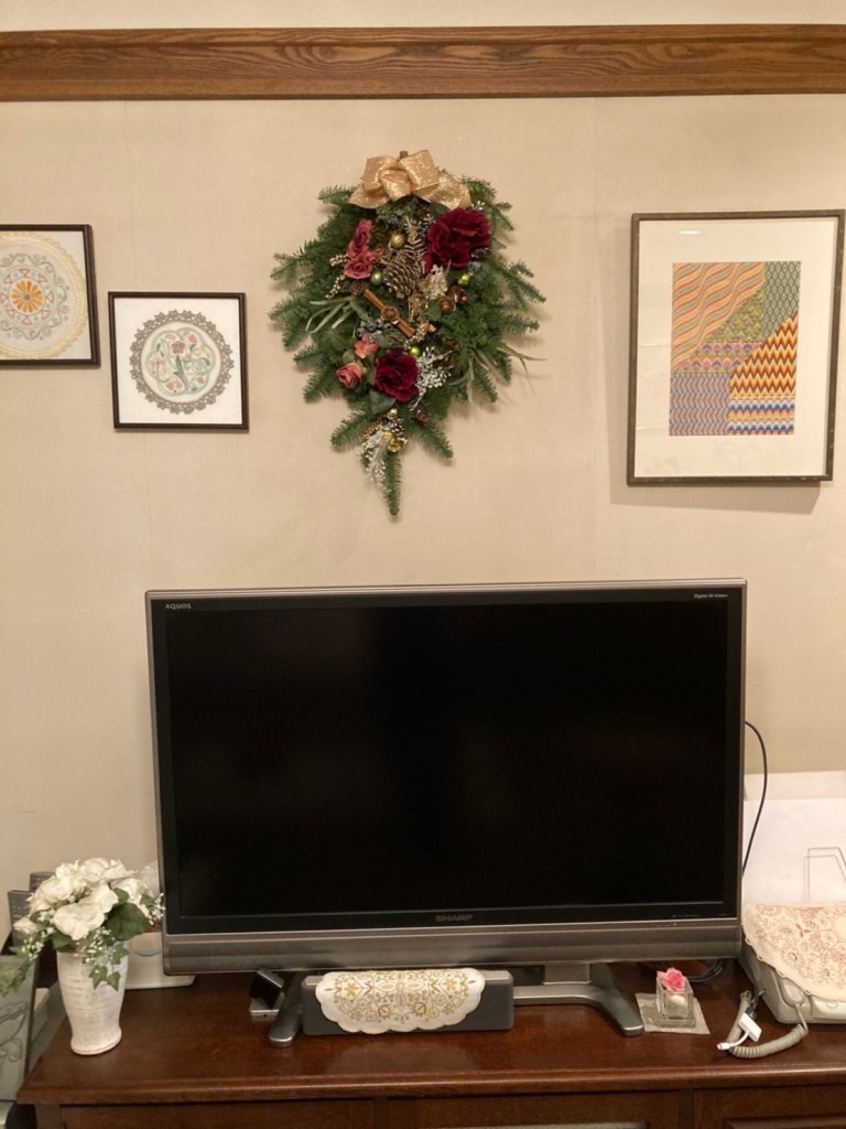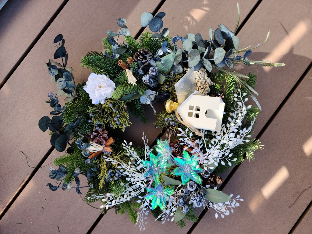 今回のスワッグリースでは、生のオレゴンヒバ・ネズの枝の実付き・アーティフィシャルフラワーのバラの赤とピンク・マツボックリ・マツボックリの小さい実物・ホワイトリーフ・ユーカリの黒い実・シナモンステイック・リボンを使い作りました。大きさ40㎝~50㎝とボリュームのある作品です。