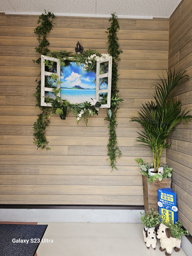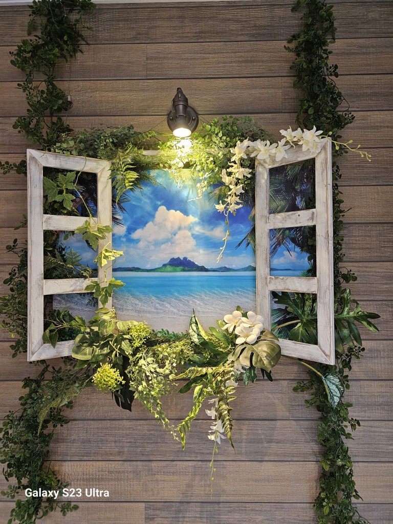 まずは、エントランスから、ご紹介します。今回は、窓から見える南国の海の雰囲気をイメージして作りました。あえて、カラフルにはせずに、潮風にあたったようなシャビーな窓枠に、グリーンを何種類か使ってます。モンステラ・ポストンファーン・スマイラックス・シダーグリーンセット・白のデンファレ・白のプルメリア・ナチュラルウッド窓枠・風景ポスター・などを使ってアレンジしてます。今までと は、異なるスタイルで、どうなるかと思いましたが、うまくいきました。爽やかな海の写真は、浄化されるようで、清々しい気持ちになれるのではないでしょうか?