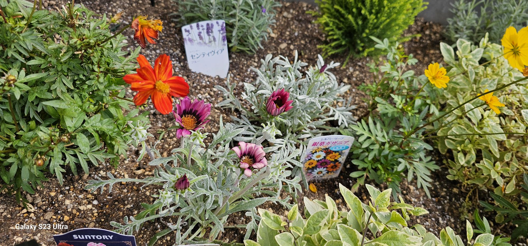今回はセンニチコウ、黄花コスモス、リンドウ、ベロニカ、カルフォルニアスターリングシルバー、セージ、ラベンダー、ローズマリー、ロータス、レモンバーム、とうがらし、ハバネロと植え替えをしました。この夏は日中はかなり暑かったのでお花もなるべく暑さに強いものを選びましたが、何とかもったようです。