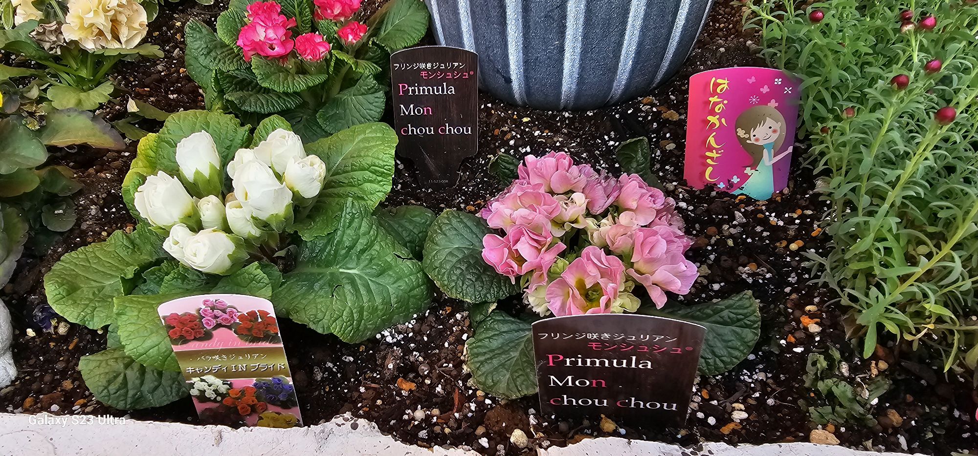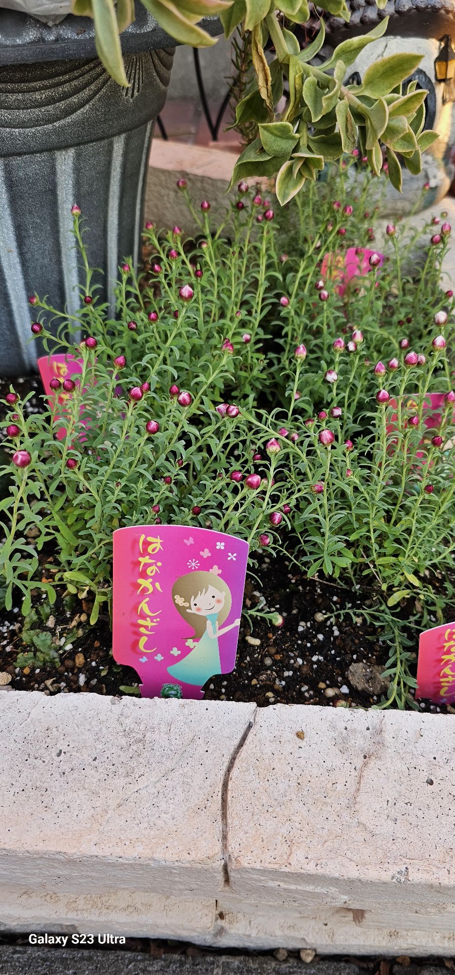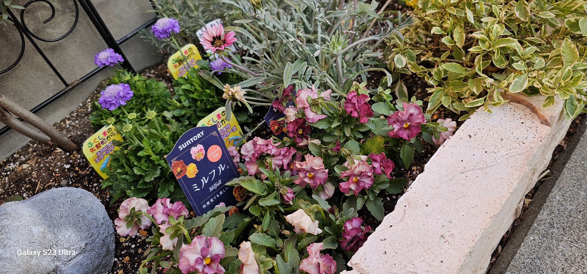 昨年植えたパンジーは八重と普通のパンジーで、まだ元気だったので、ジュリアンは八重と普通のお花と矢車草と花かんざしを植えてみました。乾燥が続いてるのでそれに耐えられるお花を選びました。
