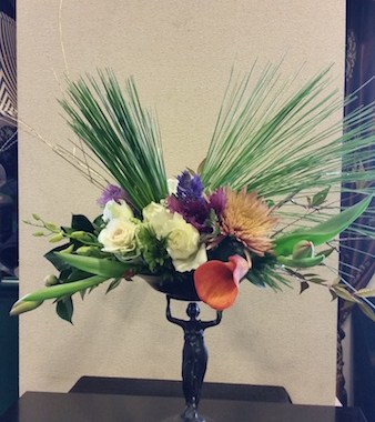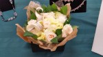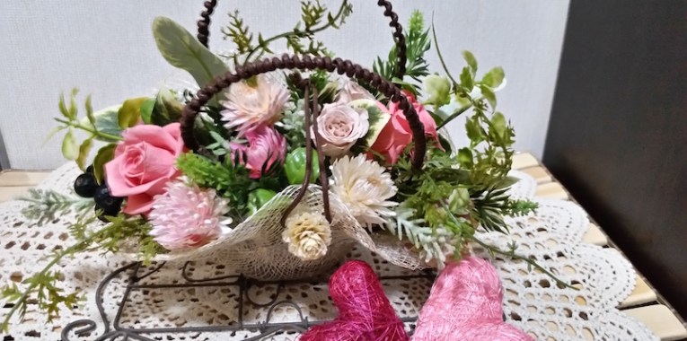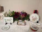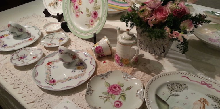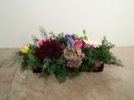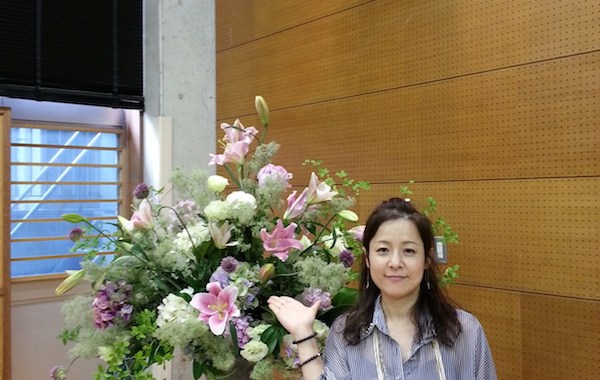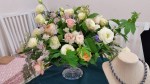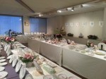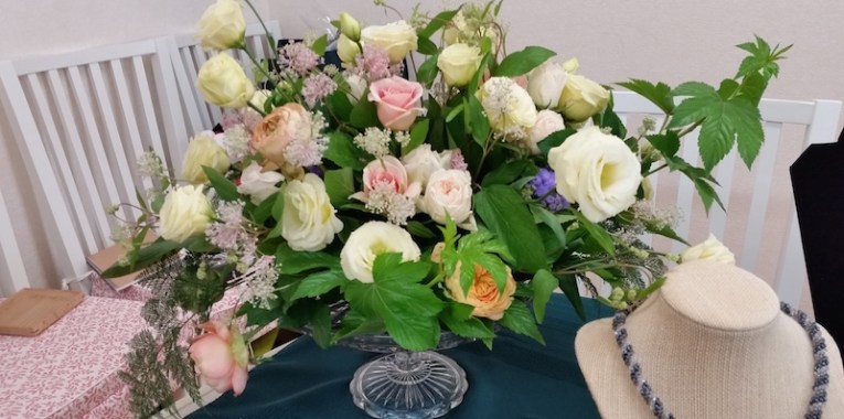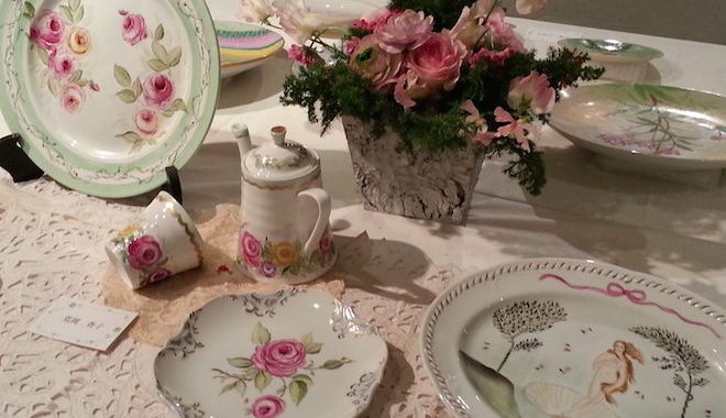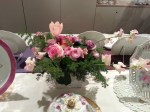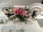 テーブルコーディネートのグループ展に、お花を飾らせていただきました。素敵な花の絵柄の器をメインにした展示ということで、主役の器を引き立てるように、ボリュームを抑えながらも、色や雰囲気できちんと調和する工夫をほどこしています。