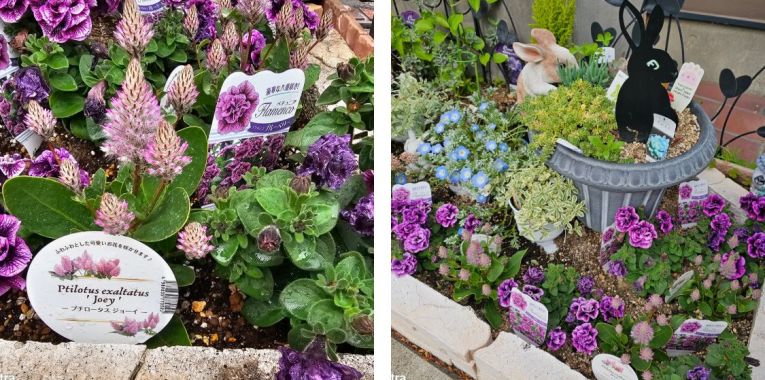 アップルブロッサムホワイトリングゼラニウム、テンケアブルー、デルフィニウム、クラマチスアーリーホワイト、ヤグルマギク、ダイアンサス、パープルウェディングカーネーション、パープルアゲラタム、ラベンダー、マーガレットデイジー、イエローシレネユニフリーラ、シルバーネモフィラ、プチローズジョーイ、ペチュニア八重咲き、白ペチュニア